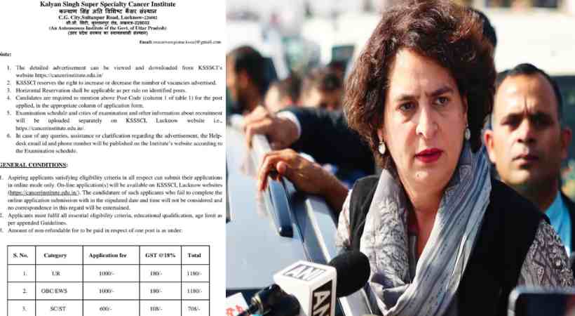 സുല്ത്താന്പൂരിലെ കല്യാണ് സിങ് സൂപ്പര് സ്പെഷ്യാലിറ്റി കാന്സര് ഇന്സ്റ്റിറ്റ്യൂട്ടില് 18 ശതമാനം ജി.എസ്.ടി ഈടാക്കുന്ന ഒരു ഫോം സഹിതമാണ് പ്രിയങ്ക സാമൂഹ്യമാധ്യമത്തിൽ പങ്കുവെച്ചത്. ഫോമില് ജനറല്, ഒ ബി സി വിദ്യാര്ത്ഥികള്ക്ക് 180 രൂപ ജിഎസ്ടി ഉള്പ്പെടെ 1180 രൂപയാണ് ഫീസ്. എസ്സി/എസ്ടി വിദ്യാര്ത്ഥികള്ക്ക് 180 രൂപ ജിഎസ്ടി അടക്കം 708 രൂപ ഫീസും ഈടാക്കുന്നതായി കാണിക്കുന്നുണ്ട്. ഫോം പൂരിപ്പിച്ച ശേഷം സര്ക്കാരിന്റെ അനാസ്ഥ കാരണമോ അല്ലാതെയോ പരീക്ഷപേപ്പര് ചോര്ന്നാല് യുവാക്കള്ക്ക് സാമ്പത്തിക നഷ്ടമുണ്ടാകുമെന്നും പ്രിയങ്ക വ്യക്തമാക്കി.