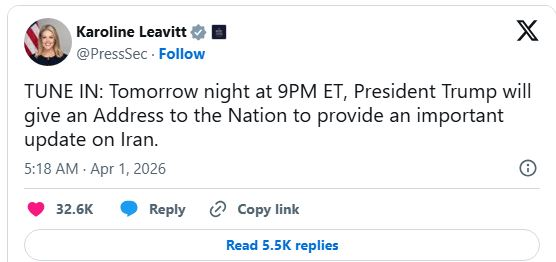 വൈറ്റ് ഹൗസ് പ്രസ് സെക്രട്ടറി കാരലിൻ ലെവിറ്റാണ് എക്സ് പോസ്റ്റിലൂടെ വിവരം അറിയിച്ചത്. ഇറാനുമായി ബന്ധപ്പെട്ട് പ്രധാനപ്പെട്ട ഒരു വിവരം പങ്കുവയ്ക്കുമെന്നാണ് കുറിപ്പിൽ പറയുന്നത്.